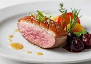 A: Slice the duck breast thinly and fan it artfully over a bed of roasted sweet potatoes. Drizzle pan jus or a tangy berry reduction around the plate for color and brightness.Garnish with fresh herbs or microgreens for a final touch of elegance.