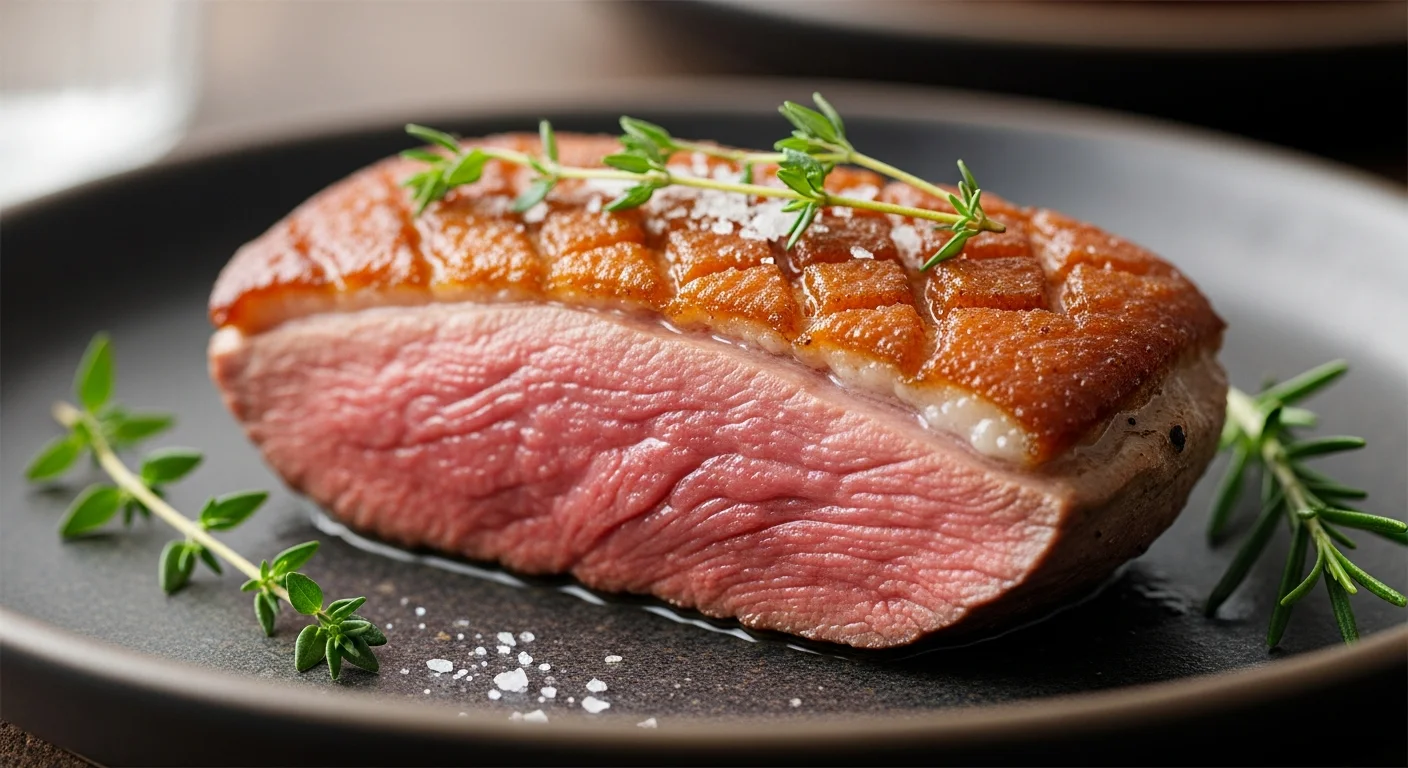 Crisp pan-seared duck breast with roasted sweet potatoes plated elegantly