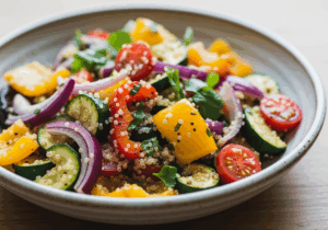 A1: As it’s more than a meal – it’s a love letter to your cardiovascular health. Packed with heart-kind ingredients like fiber-rich quinoa, antioxidant-loaded roasted veggies, and a zesty lemon dressing, this salad supports healthy blood flow, lowers cholesterol, and fuels your body with vital nutrients.
