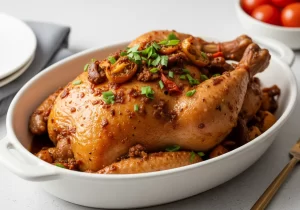 - Stuff the cavity: Insert lemon quarters, smashed garlic cloves, and fresh herbs into the chicken’s cavity. This imparts aromatic moisture and depth during slow cooking.