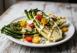 present grilled romaine salad on a rustic wooden board or a chilled ceramic plate to accentuate its smoky appeal. Garnish with fresh herbs like parsley or chives for subtle freshness and vibrant green color.Pair with grilled chicken or seared shrimp for a fuller meal, or serve alongside crusty artisan bread to soak up the bold dressing. For a vibrant pop, drizzle a touch of balsamic reduction or add grilled peaches during summer months.