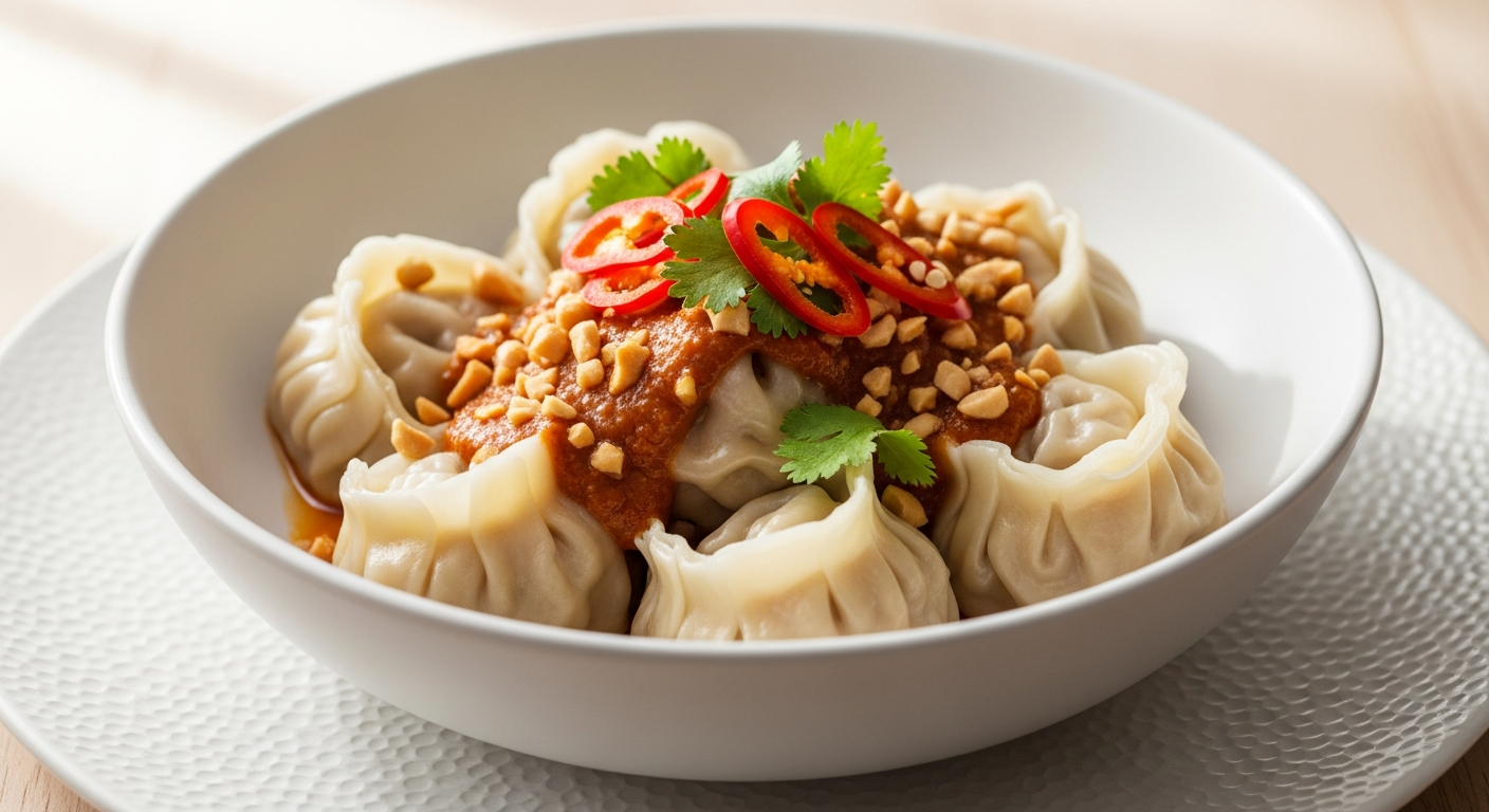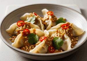 At the heart of thes chicken dumplings, the spicy peanut sauce transforms every bite into an explosion of bold, creamy flavor. Crafting the sauce involves balancing spicy, nutty, sweet, and tangy notes to complement the savory filling flawlessly.