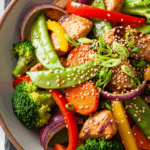 - Add the protein (chicken or tofu). Stir-fry until cooked through and lightly caramelized, approximately 4-5 minutes.