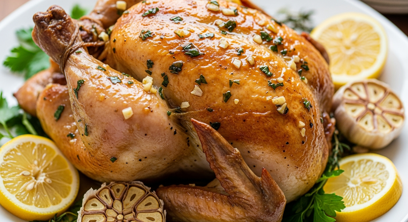 Zesty Lemon Garlic Roasted Chicken with crispy skin and lemon garnish
